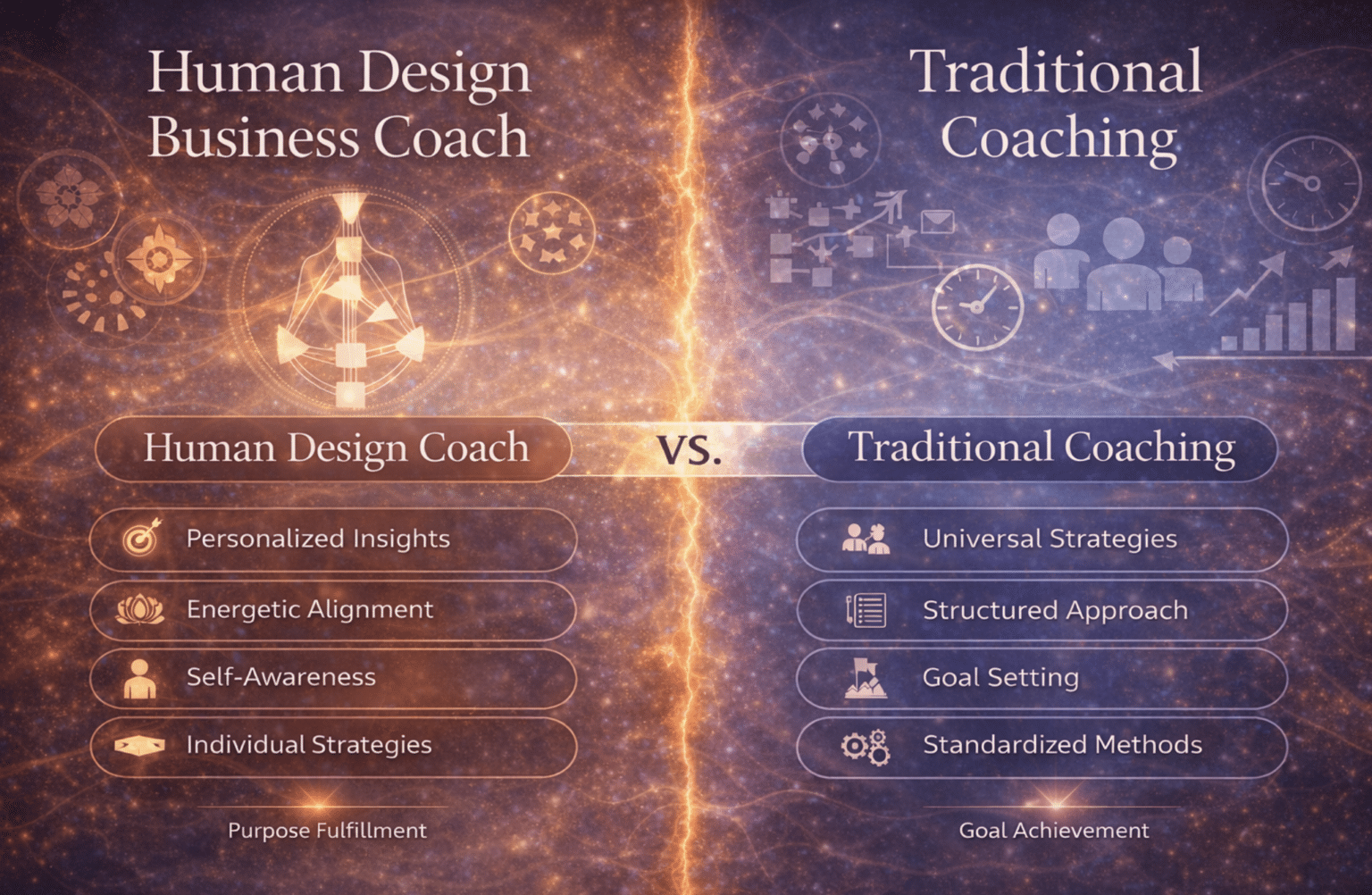 By emphasizing long-term growth and fulfillment, Human Design coaching helps you establish not only a flourishing business but also a fulfilling life, making it a compelling alternative to traditional coaching approaches.